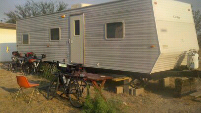 The winds we're so bad we couldn't make it past 60 miles. But we found mike and maryann who rented us a trailer out back. They made us BBQ brisket. Sandwhiches for dinner and breakfast.